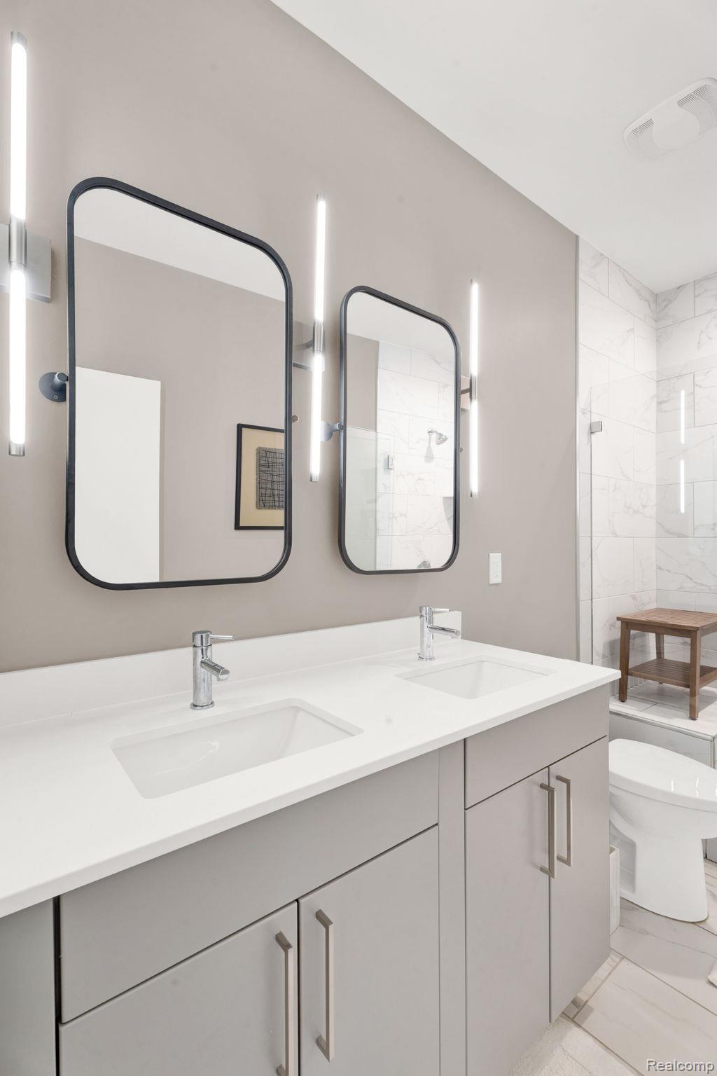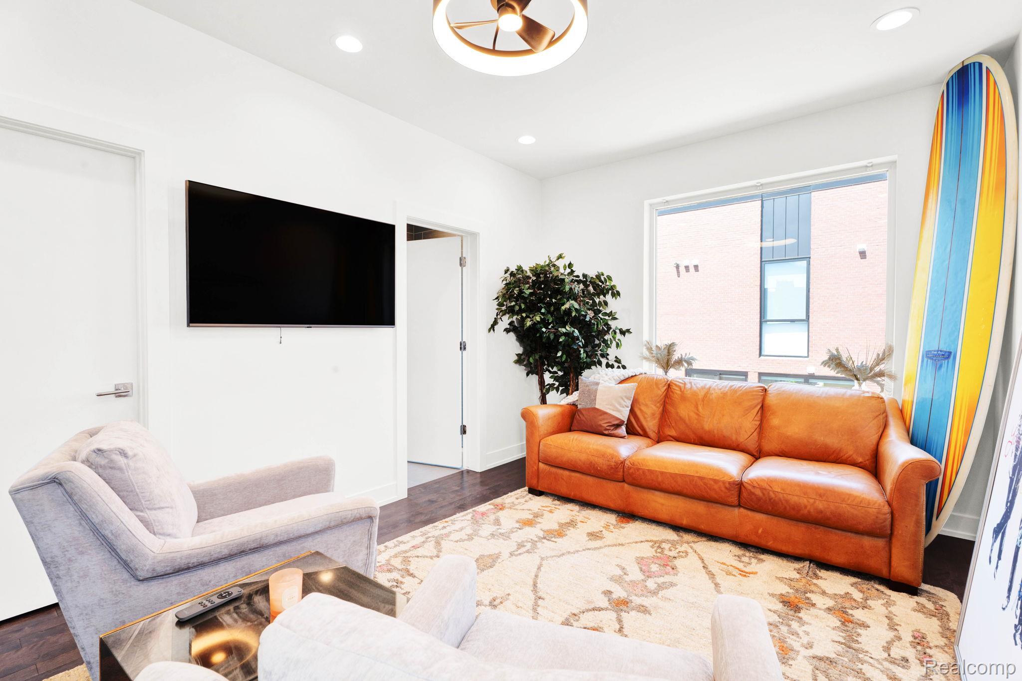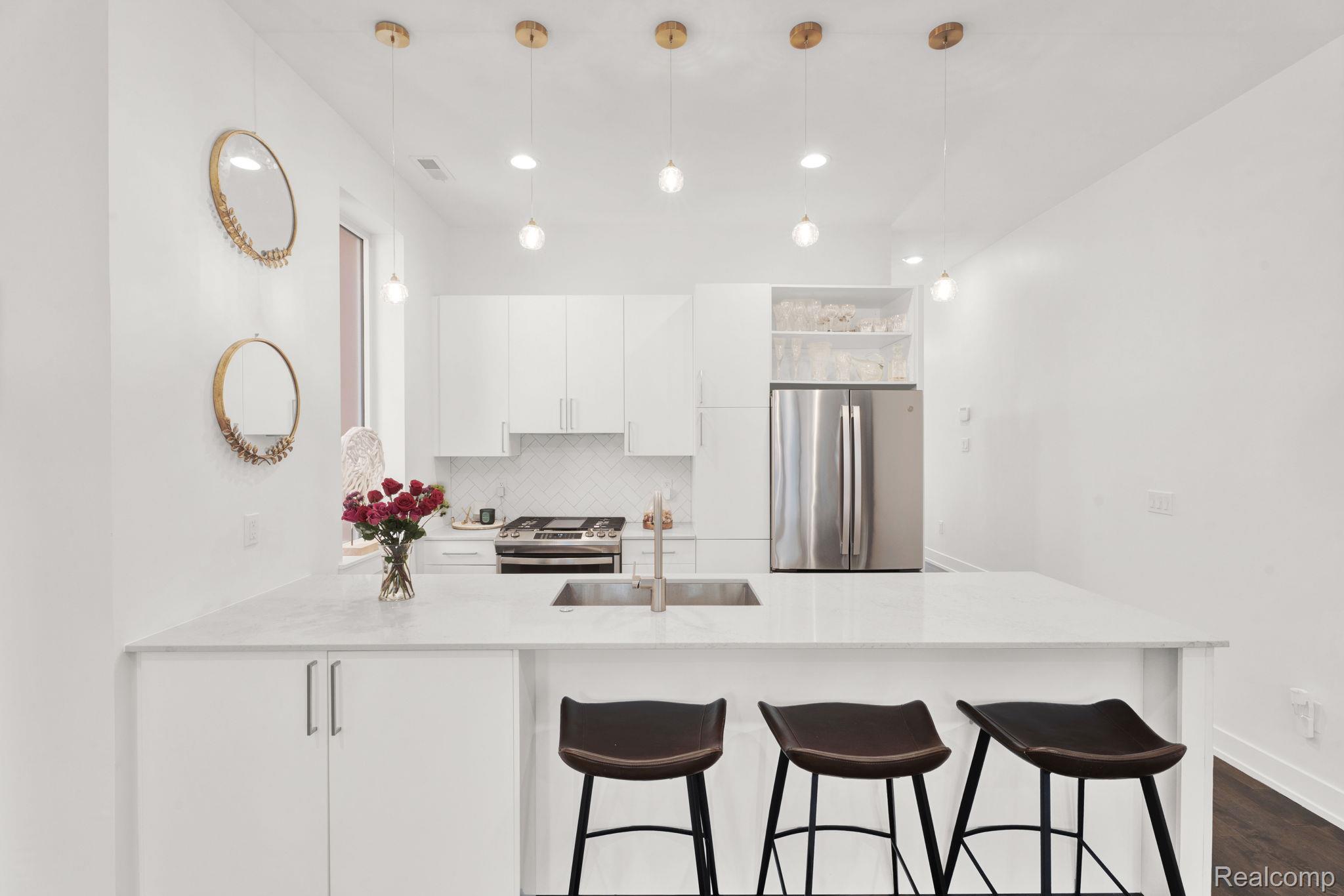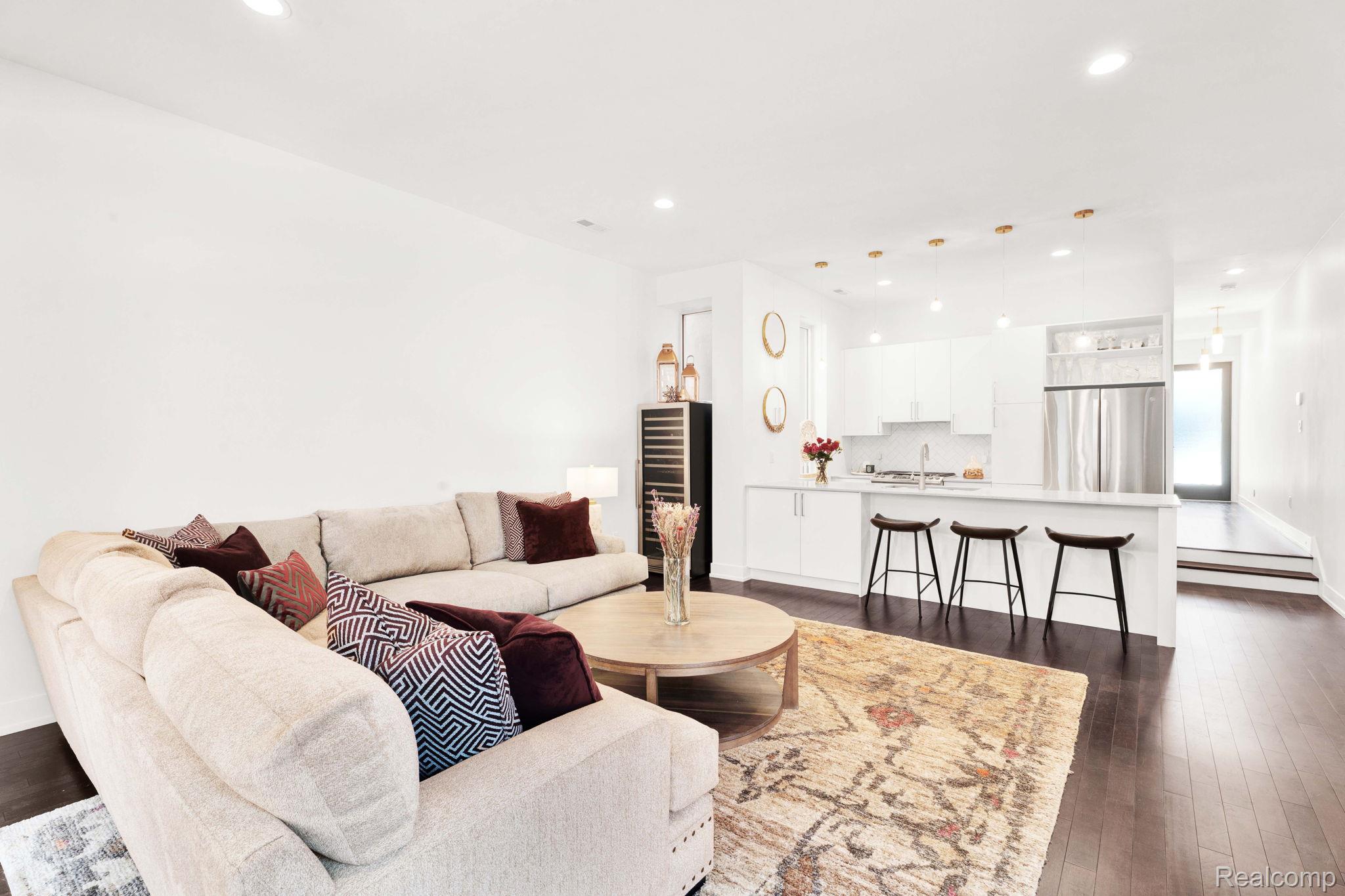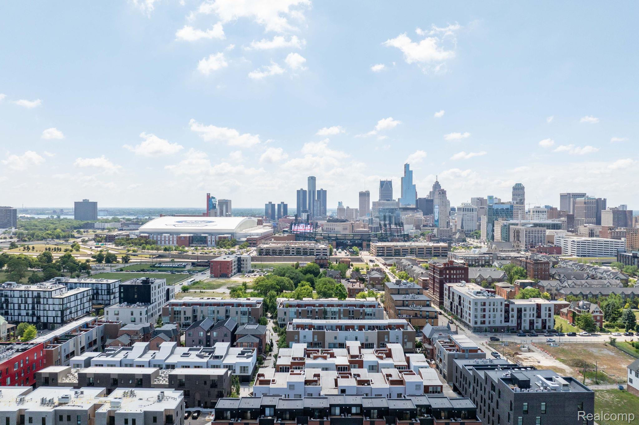 A rare find in City Modern—a beautiful and stylish 2 bedroom/3.1 bath townhouse features the only floor plan of its kind in the neighborhood. This home offers a bright and spacious layout with clean modern finishes and designer lighting. The main level features open-concept living room with a sleek kitchen with quartz countertops, soft-close cabinets and stainless steel appliances. There’s also a convenient half bath on this level. Upstairs, you’ll find the spa-like primary suite with balcony to enjoy your morning coffee. The en suite bath has a large tile shower. The second bedroom and another full bath are also on this level. Let’s not forget the loft space that could be a family room or a sitting area. The third level adds a flex space with another full bath—perfect for a third bedroom, gym, or office. The private rooftop deck is a showstopper with incredible views of the city. There’s an attached one car garage with plenty of storage. Don’t forget the 24-hour private security. Just steps from Detroit’s best—Little Caesars Arena, Comerica Park, Bodega, Lena and Grey Ghost. This one truly has it all!
