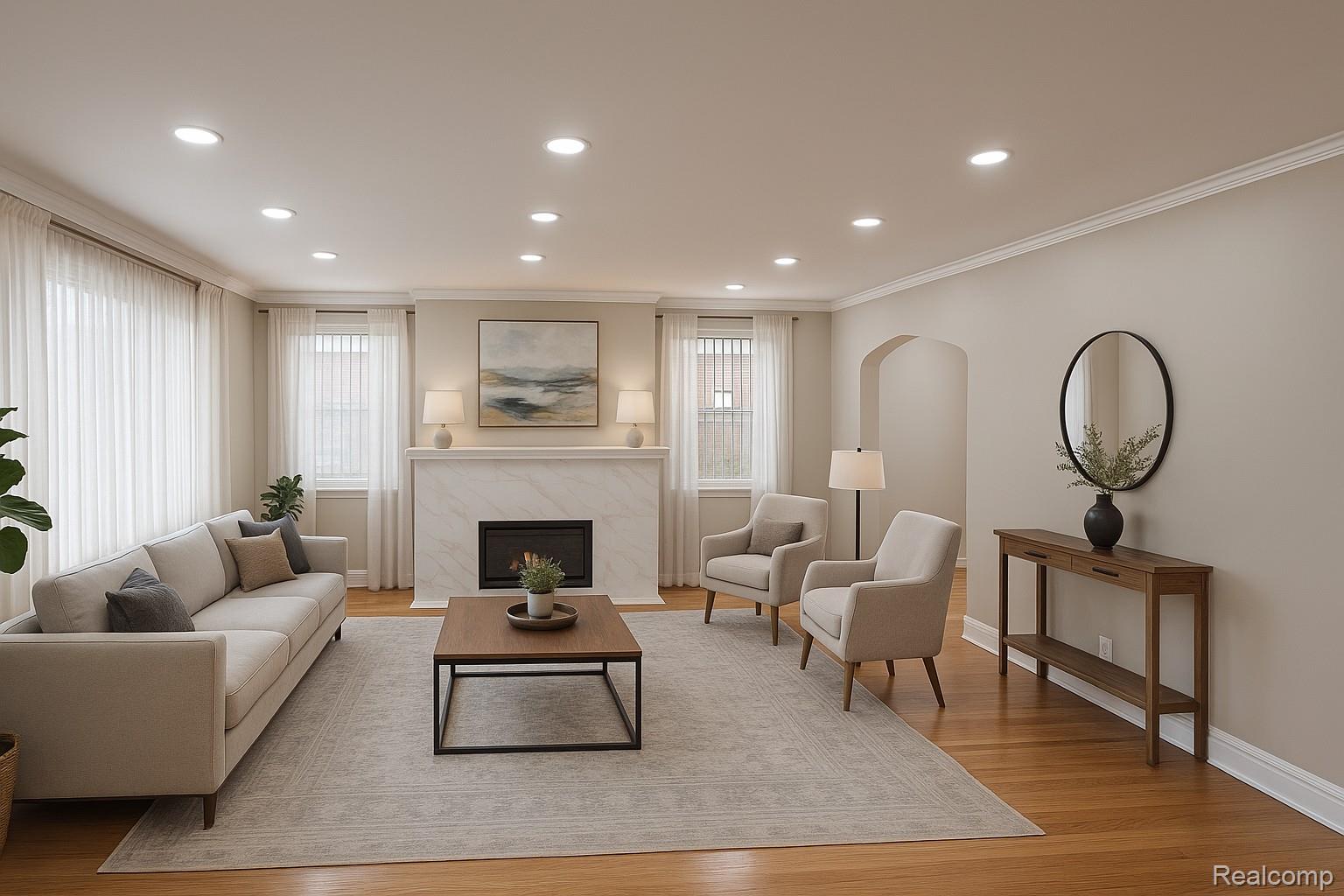 Charming brick two-story with classic gables and a welcoming covered front porch sets the tone for this move-in–ready home. Step inside to a sun-filled living room with refinished hardwood floors, crown molding, and recessed LED lighting centered by a sleek, marble-look fireplace. An arched opening leads to the open-concept dining area, anchored by a modern sculptural chandelier and flowing seamlessly into the updated kitchen. Here you’ll find white Shaker cabinetry, polished stone counters, an elongated-hex backsplash, peninsula with bar seating, and a stainless range hood over a 5-burner gas cooktop—plus a deep under-mount sink beneath twin windows and durable large-format tile flooring. The main bath is crisp and refreshed with a tub/shower wrapped in large-format marble-look tile and mosaic accent band, stone-look vanity top with under-mount sink, bright lighting, tile floor, and a handy linen closet. Downstairs, the finished lower level expands your living space with a wide-open rec room, wood-look vinyl flooring, exposed black ceiling with recessed lighting for a modern loft vibe, a sleek bar for entertaining, multiple closets, and a separate utility/storage room—ideal for a media area, home gym, or play space. Outside, fresh landscaping frames the steps, and a wide paved driveway runs alongside the home for easy off-street parking. Timeless curb appeal meets contemporary updates—ready for everyday comfort and effortless entertaining.